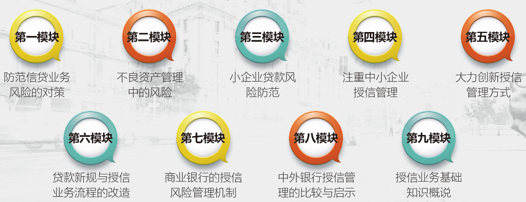 《信貸視角下的-企業財務報表閱讀與分析》、《財務報表(會計舞弊)真假識別方法與技巧》、《小企業征信調查實務》、《微小企業貸前調查技術》、《風險貸款保全方法與技術》、《貸后管理經驗與方法》、《授信業務管理與信貸風險控制》等。