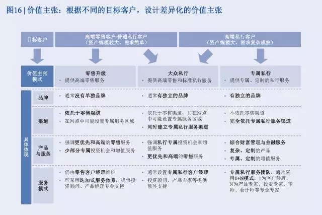 以客戶為中心意味著需要針對不同的目標客群設計差異化的價值主張。縱觀國內外領先私行機構,根據其為私行客戶與零售客戶提供的價值主張差異化程度,有零售升級、大眾私行和專屬私行三種模式,其背后實質是對不同目標客戶及其需求差異的不同考量。總體而言,資產規模越大、或者是財富管理需求越復雜的客戶,其對于專屬的私人銀行服務體系的要求越高,與零售銀行服務體系的差異越大。傳統上中國很多大型商業銀行采用了零售升級的業務模式,與其服務的主體客戶實際的財富管理需求并不復雜有關。而隨著客戶的成熟和機構能力的提升,部分高凈值客戶越來越呈現出與零售客戶迥異的財富管理訴求,機構也需要在價值主張設計上進行相應的調整和升級。具體而言,三個模式的價值主張差異點集中在品牌、渠道、產品與服務和服務模式四個方面(參閱圖16)。