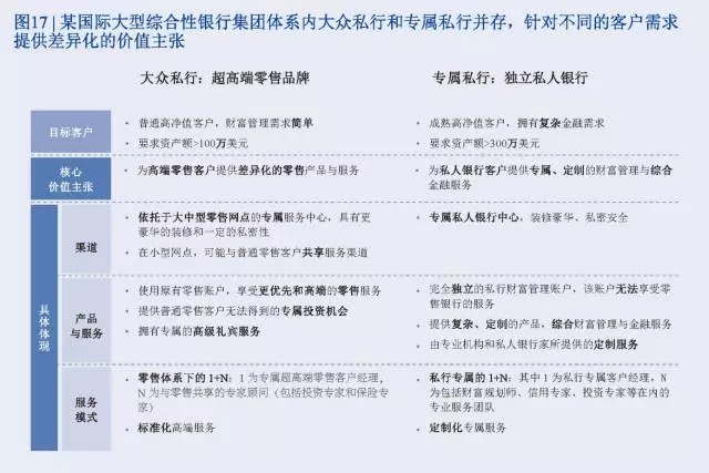 在一個金融集團內部,可能同時存在不同的價值主張選擇,以多套體系差異化地服務更廣泛的客戶。以某國際大型綜合性銀行為例,其集團體系內主要有兩個專門服務高凈值客戶的機構,一個是隸屬于零售銀行體系下的超高端零售品牌,一個是完全獨立于商業銀行的私人銀行品牌。其中,超高端零售品牌目標服務可投資金融資產超過100萬美元的高凈值客戶,能夠滿足其主流的綜合金融需求,包括日常結算、財富管理、融資服務等;而私人銀行則專注于服務可投資金融資產超過300萬美元的高凈值客戶,旨在滿足其復雜、多樣化的金融需求,例如定制化投資產品設計、全球股票市場投資、特殊市場投資等。兩個機構在渠道、產品與服務、服務模式等三個方面對客戶的價值主張均不相同。簡言之,超高端零售品牌提供的是超高端的零售銀行服務,而私人銀行則是提供私人、專屬的全方位個人與家族金融服務(參閱圖17)。