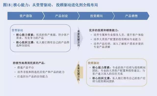在目前的市場、客戶、競爭大環境下,掌握資產端到財富端全價值鏈能力的全線布局型財富管理機構優勢凸顯。首先,在中國經濟進入新常態、優質資產稀缺的背景下,資產獲取和產品創設能力是財富管理機構的重要競爭力。中國高凈值客戶的投資收益率預期雖然在下降,但客戶調研顯示,產品仍是客戶選擇私行機構的首要考量因素。因此,能夠提供優質甚至專屬的投資機會,是財富管理機構持續吸引客戶的核心競爭力。第二,財富管理機構需要打造強大的產品平臺,并在此基礎上培養大類資產配置和專業投顧能力。隨著剛性兌付的打破及客戶需求的成熟與分化,財富管理機構不能僅局限于提供比拼收益率的固收類產品,而是要能夠提供滿足不同風險收益偏好、跨市場的豐富產品類別。同時,還需要為客戶提供專業的大類資產配置和投資顧問建議,以持續性的為客戶創造財富管理價值、吸引客戶。,如前章所述,資產管理機構已經有很明顯的向下游財富業務延伸的趨勢,與之類似,財富管理機構應積極向上游資管業務挺進。價值鏈上的各個環節相輔相成:上端的資管能力能夠有效吸引下端的財富資金,下端的財富資金是上端資管產品的銷售渠道保障。因此,掌握從資產端到財富端的全價值鏈能力,是領先資產管理機構和財富管理機構的共同追求。