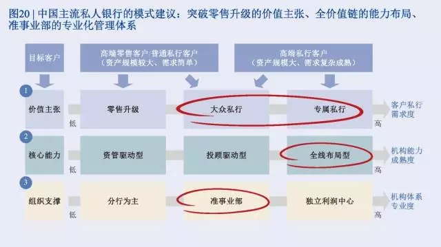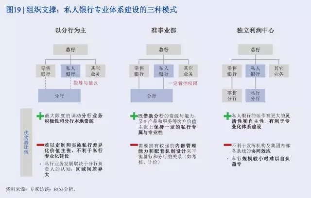 如果私行客戶數量較少、但集中度和戶均資產高,則可以選擇總部直接服務的模式,用高度專業化的體系來服務這部分“少而精”的客群;一些區域性城商行、信托和券商機構可以考慮此種模式。而對于全國性機構,如果私行目標客戶地域分布較廣、還有很大的增長潛力,則應當更多依靠現有分支機構來展業和維護。,還要考慮私行業務的發展階段。如果私行客戶已經積累到一定量級、業務盈利性較好,私行有能力調配更多的資源并自負盈虧,便可以考慮專業化進程的進一步推進,即采用準事業部甚至獨立利潤中心的模式。