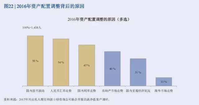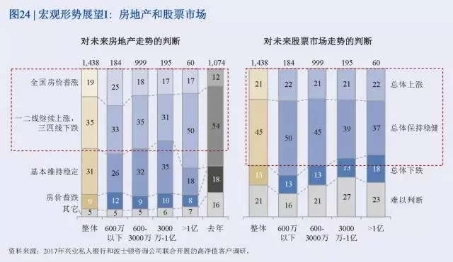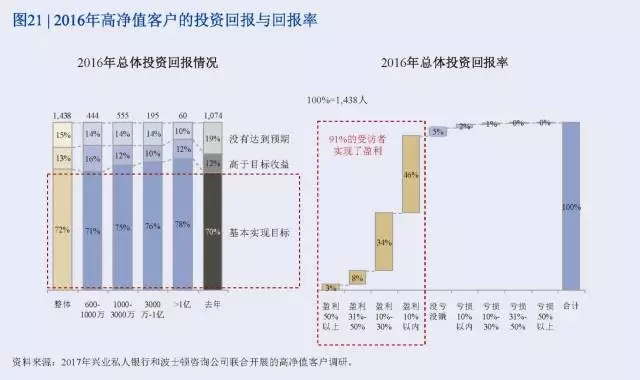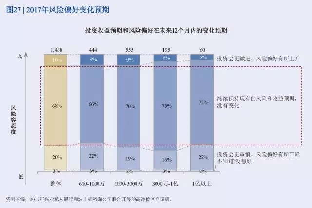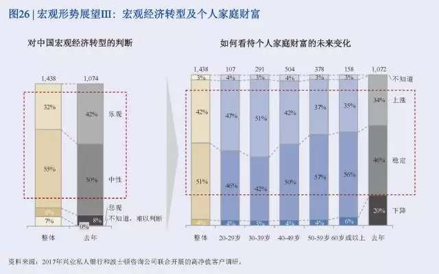 興業銀行和波士頓咨詢公司(BCG)開展的2017年中國財富市場調研主要研究了經濟新常態下高凈值人士的基本信息、投資行為與金融需求、對財富管理機構的選擇。具體內容包括人口特征、財富來源、職業與行業分布、風險偏好、對宏觀形勢展望、私行產品和服務需求特征、私行機構偏好與需求等。