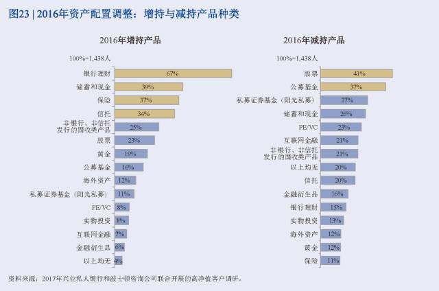 高凈值人士預計在2017年維持相對穩健的投資風格與風險偏好,但對股票市場的信心度有所提升。近7成的受訪者預期在2017年的風險偏好將維持不變,但另有2成受訪者表示2017年的風險偏好將會更加謹慎(參閱圖27)。金融產品投資方面,在增持產品種類中,銀行理財、存款、信托、保險和股票占比較高;而在減持產品種類中,信托、非信托和非銀行的固收類產品以及存款占比較高(參閱圖28)。可見,受訪者對銀行理財產品仍舊相當信任,但對非銀行發行的固收產品的觀點出現分化,這可能是由于打破剛性兌付的預期走強、固收類產品收益率走低等多重原因共同導致。同時,繼2015年股市大幅震蕩后,高凈值客戶在調研中表現出了對股票的較高興趣,對股權、權益類產品的信心有所增加。