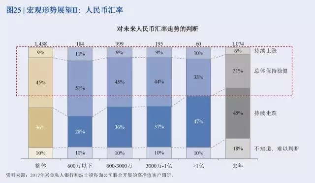 展望2017年,從客戶調研結果看,高凈值人士對中國宏觀經濟和投資形勢較為樂觀,并對自己家庭財富的增長富有信心。房市:54%的受訪者認為至少一二線城市的房地產價格將繼續上漲,但整體上漲預期沒有去年調研強烈。股市:66%的受訪者認為股票市場將保持穩定或上漲,對股市的信心回暖(參閱圖24)。匯市:近6成受訪者認為人民幣匯率將保持穩健甚至上漲,對人民幣貶值的預期減弱(參閱圖25)。宏觀經濟:87%的受訪者對未來宏觀經濟轉型持積極態度,同時93%的受訪者認為在這樣的宏觀背景下,自己家庭的財富將保持穩定或上漲。(參閱圖26)。