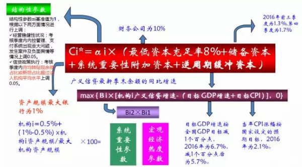 宏觀審慎資本充足率(Ci*)=αi×(資本充足率8%+儲備資本+系統重要性附加資本+逆周期緩沖資本)