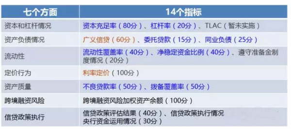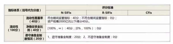 流動性評估包括流動性覆蓋率、凈穩定資金比例2個定量指標和遵守準備金制度情況1個定性指標。分數分別為40分、40分和20分。