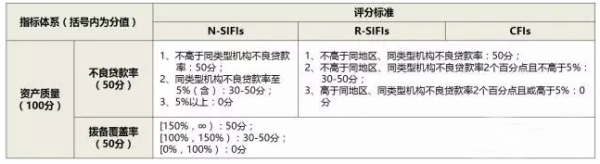 首先,對N-SIFIs而言,不高于同類型機構不良貸款率得滿分50分,超過了同類型機構,但在5%之內可以得到30-50分。R-SIFIs和CFIs考核標準相同,不高于全省同類型機構不良貸款率(含):50分;不高于全省同類型機構不良貸款率2個百分點(含):30-50分。高于全省同類型機構不良貸款率2個百分點或高于5%:0分。