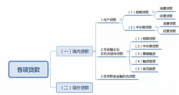 各項貸款是指金融機構在保留資金或貨幣所有權的條件下,以不可流通的借款憑證或類似憑證為依據,暫時讓渡資金使用權所形成的債權,包括信用卡及賬戶透支、個人經營和消費貸款、單位經營貸款、固定資產貸款、并購貸款、貿易融資、融資租賃、各項墊款、票據融資等。
