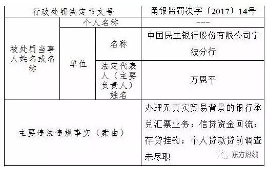 在這批處罰文件中,民生銀行寧波分行因辦理無真實貿易背景的銀行承兌匯票業務、信貸資金回流、存貸掛鉤和個人貸款貸前調查未盡職等問題,被罰90萬元。