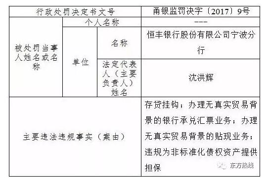 而在寧波市銀監局5月10日公布的處罰決定中,恒豐銀行寧波分行則因存貸掛鉤、辦理無真實貿易背景的銀行承兌匯票業務、辦理無真實貿易背景的貼現業務和違規為非標準化債權資產提供擔保等被罰款90萬元。